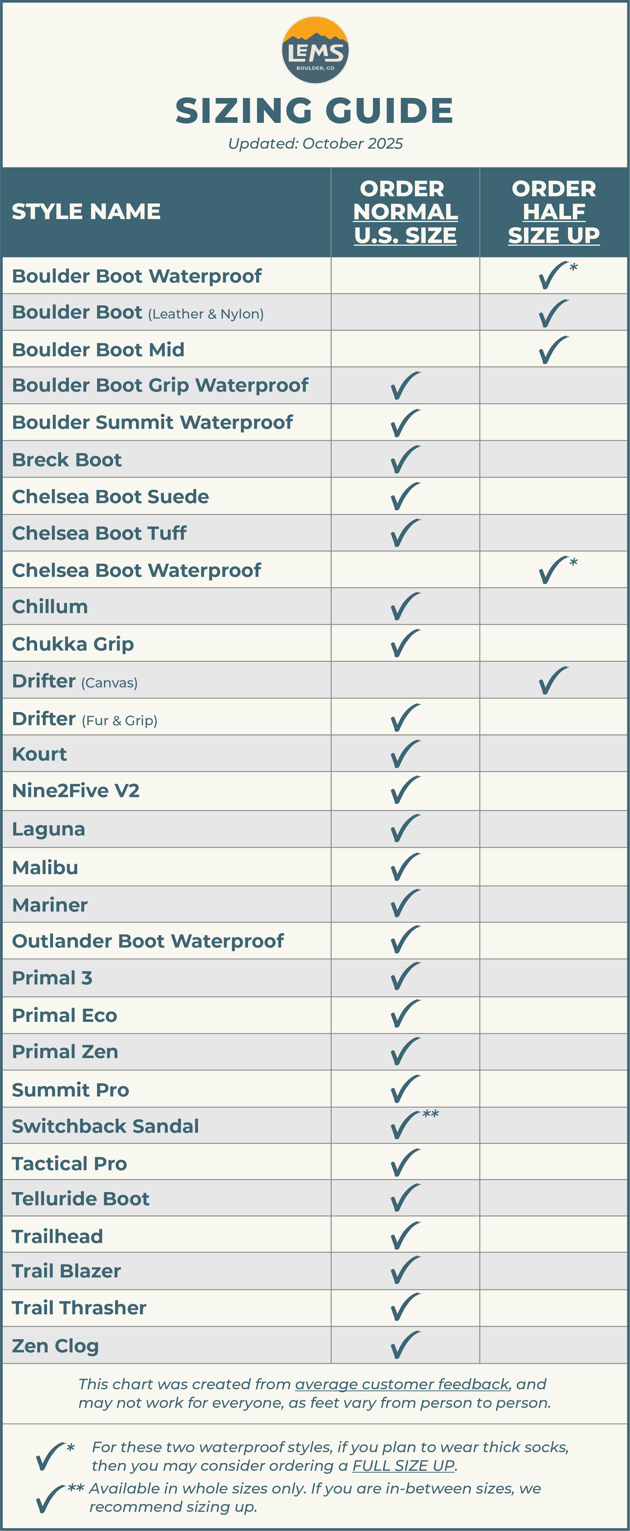 - All of our shoes are unisex (except the Laguna). For example, a Boulder Boot in Women's 9.5 is the same exact shoe as a Boulder Boot in Men's 8