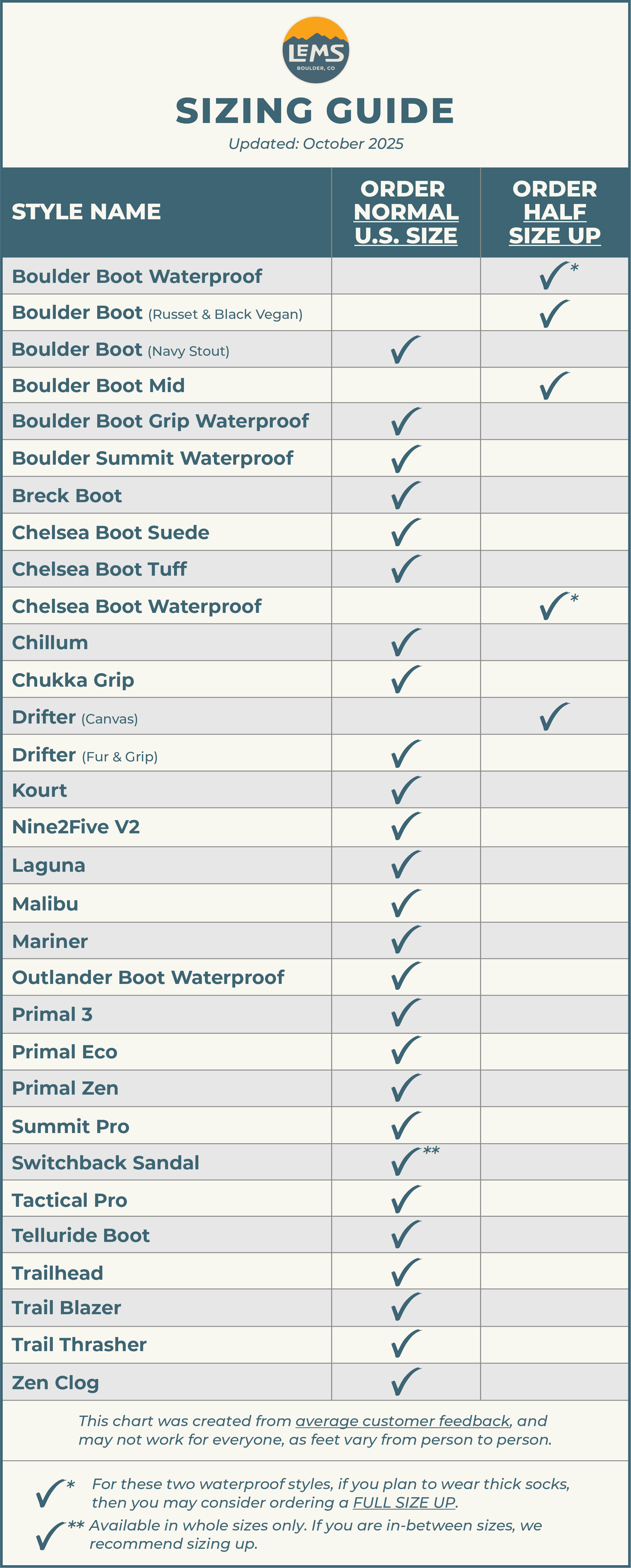 - All of our shoes are unisex (except the Laguna). For example, a Boulder Boot in Women's 9.5 is the same exact shoe as a Boulder Boot in Men's 8